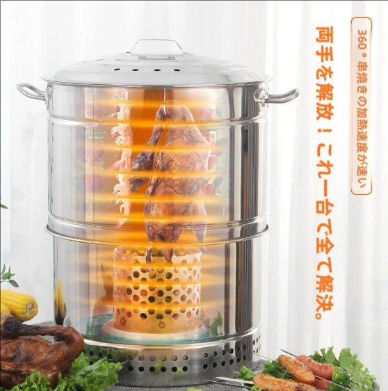 - 無煙スモークレス ステンレス製 業務用 吊り下げ式ロースター 串焼き機 丸焼き 鴨 アヒル ガチョウ ラム脚 燻製 バーベキューコンロ 回転焼