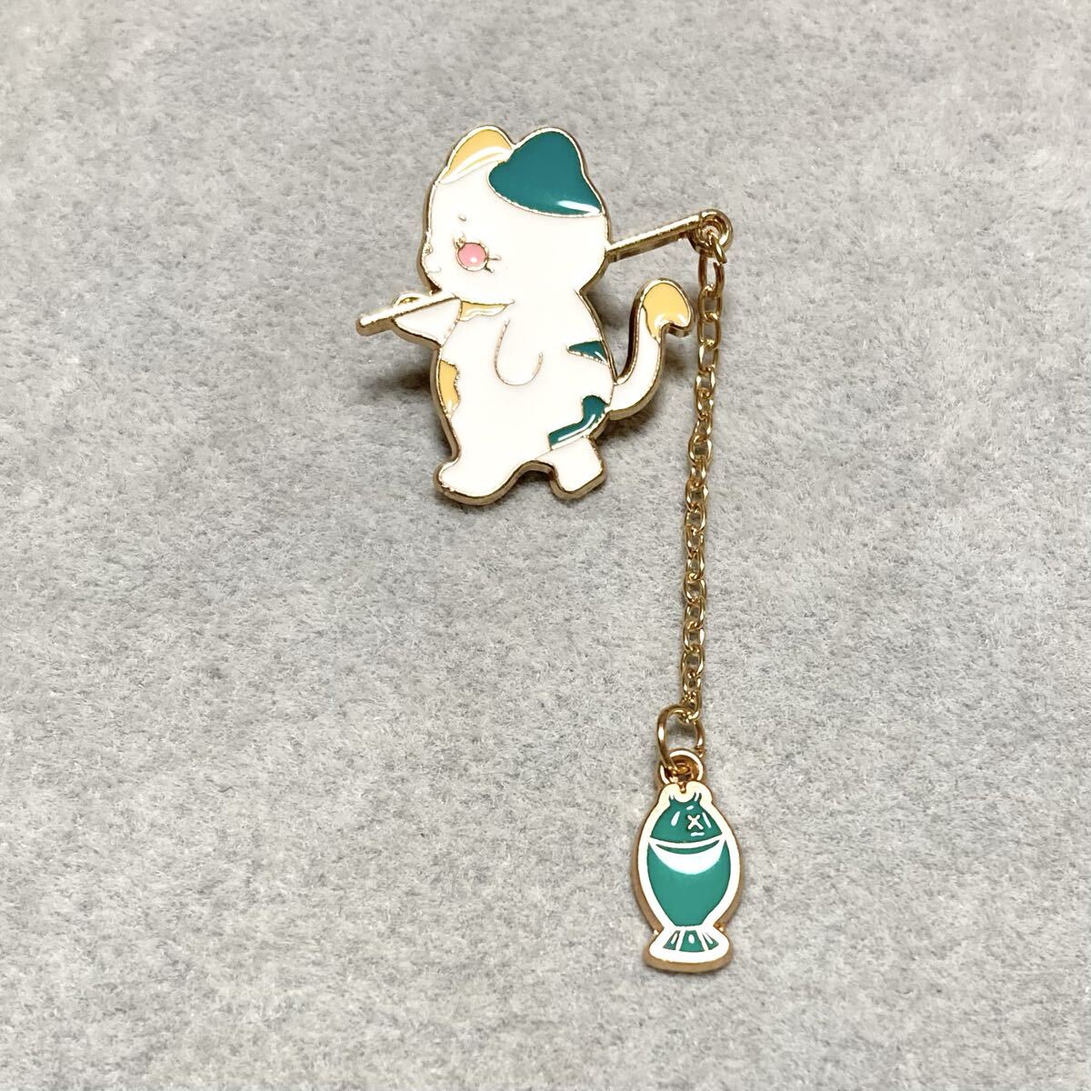 - ミケネコ魚釣りピンバッジ三毛猫フィッシングピンズ竿ねこピンブローチ