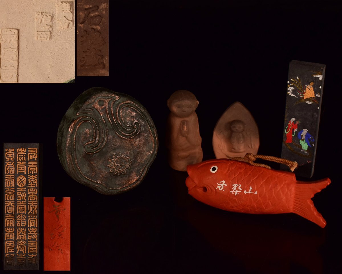 X262 【泉美】郷土玩具 石地蔵 雲板 固形墨 書道具 神鈴 土鈴 鈴 魔除け 神社 置物 オブジェ 飾り ストラップ 5点拍卖