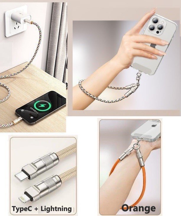 - スマホハンドストラップ オレンジ 30cm 充電ケーブル 2in1 TypeC + Lightning 充電コード