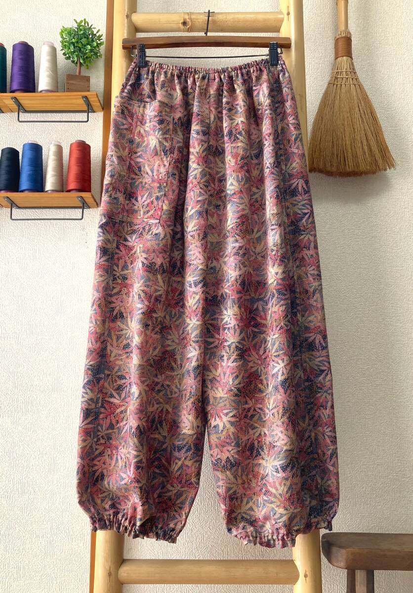 - 鎌倉まるか堂 着物リメイク 紬 夜色紅葉のもんぺ風 ●絹混 ●ゆったりまるっこいシルエット L~LL●裾ふわパンツ●洗濯OK