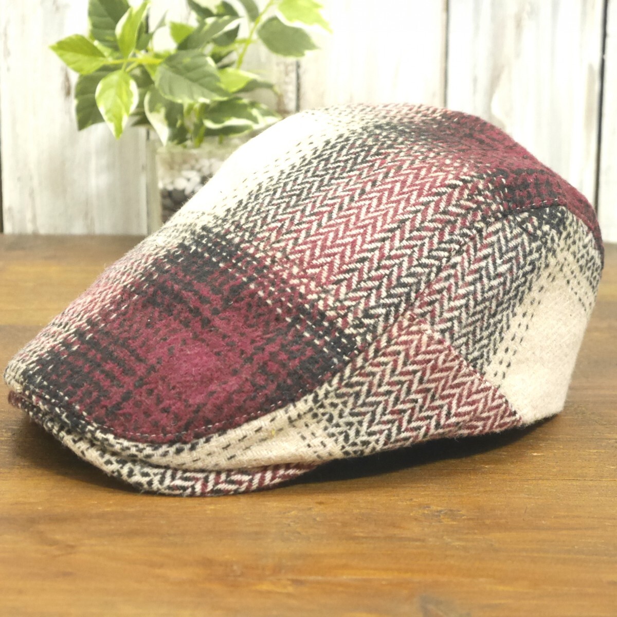 - ウール風 ハンチング ヘリンボーン グラデーション ベージュ レッド シンプル サイズ調整可 送料\450 男女兼用