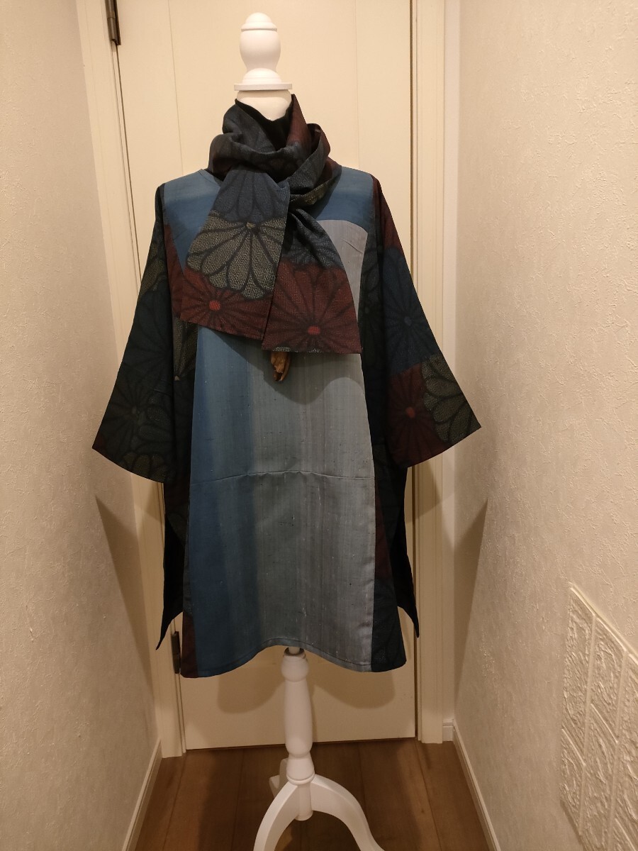 - * 着物リメイク*アンティーク着物 結城紬 グラデーション藍紬 Aラインチュニック 超大きいサイズ