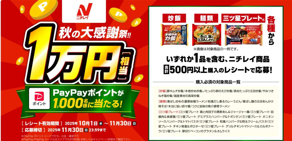 - 懸賞 応募 ニチレイ PayPayポイント 1万円相当 1000名 当たる レシート 応募口数3倍
