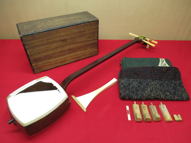 - 三味線 中棹 短棹 丸打胴 山サワリ 紅木 バチ 木製ケース付き 和楽器 管理7N1107D