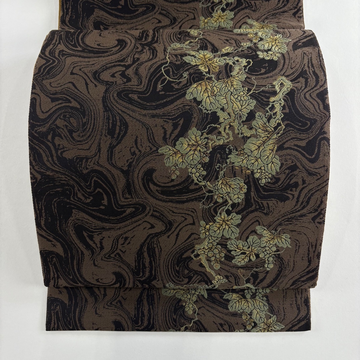 - 【美品】 袋帯 名品 葡萄 幾何学模様 金糸 焦茶色 六通 正絹 【中古】