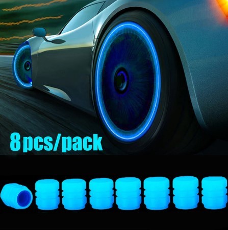 > 車/バイク用 タイヤ エアバルブキャップ 蓄光蛍光ブルー 夜間に光る タイヤバルブキャップ エアキャップ 8個セット