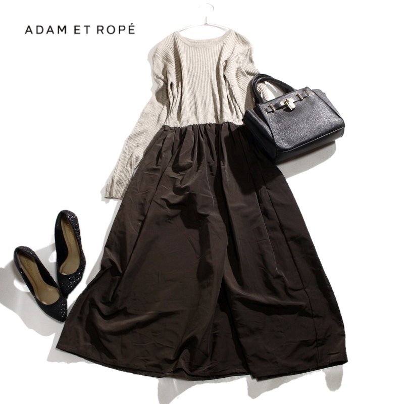 - 美品 ADAM ET ROP アダムエロペ ドッキングワンピース リブニット ロングワンピース F グレイッシュ ベージュ×ブラウン ニットワンピ