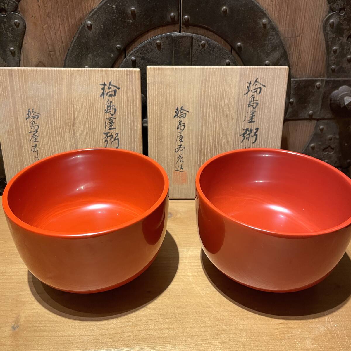 - 輪島屋本店 塗師哲舟作 美しい粥椀 二点セット 共箱 美品 状態良好 ほぼ未使用■輪島塗 漆器 お椀 骨董 茶道具■a858