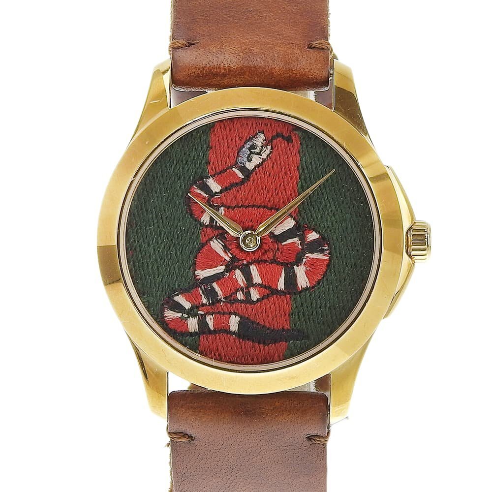 - ■ 1円 ~ 中古 参定12.6万■ グッチ GUCCI ■ Gタイムレス キングスネーク YA1264012 ■箱保 腕時計 クォーツ シルバー ゴールド スネーク