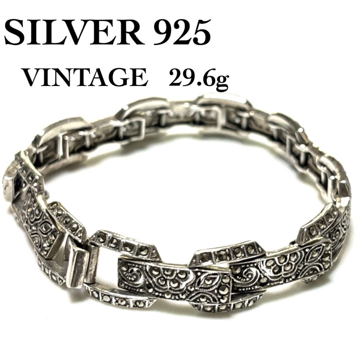 > 925 シルバーブレスレット SILVER925 ヴィンテージ ラインストーン 総彫刻デザイン 腕回り 約18cm 29.6g