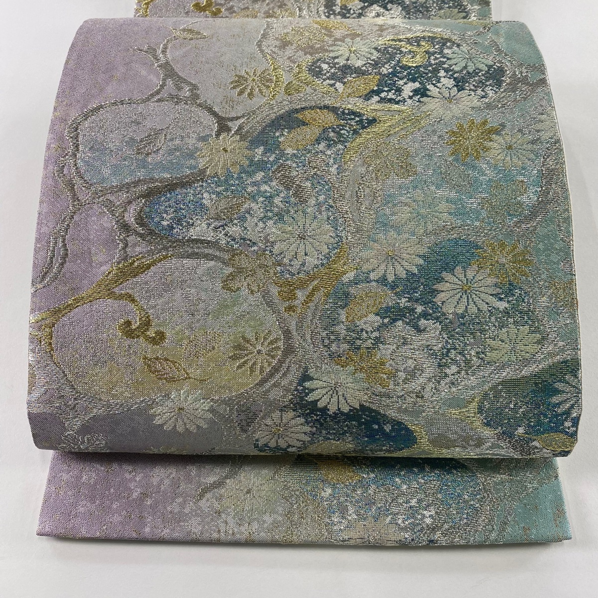 - 【美品】 袋帯 秀品 菊 水面 金銀糸 箔 青灰色 六通 正絹 【中古】
