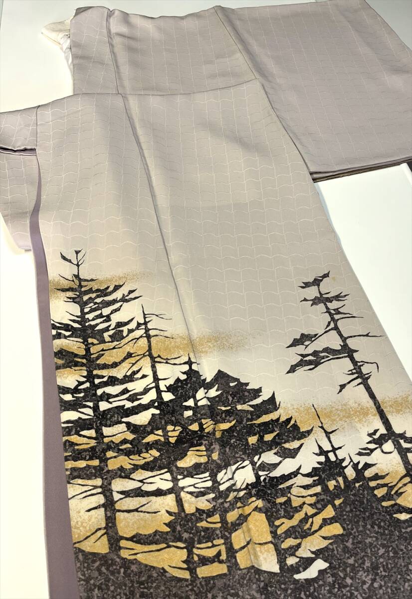 - 花とら●リサイクル着物 裾柄 森 木 薄灰紫 リメイク 素材 細工用 251105
