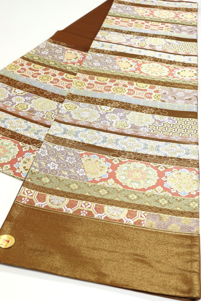 ※こちらの商品にはお仕立てはついておりません。 (お仕立て上がりの長さ目安:約4m35cm) 西陣織『志都香』謹製、高級袋帯(六通)をご紹介致します。 しなやかな帯地は、茶色地にゴールドの引箔が施されております。 全体には、柳色、藤色、薄い赤色、白色、薄水色などのお色目で、邪の中に、華文や菱文、蜀江文、唐花文などが織り上げられております。 帯地に織り込まれた金糸が上品な輝きを添えております。 雅やかで格調高い印象の帯でございます。 -状態・素材:絹80% ポリエステル10% レーヨン5% 指定外繊維(紙)5% -落款・証紙:西陣織工業組合 証紙No,2291 志都香 謹製 -参考着用年代:30代~幅広い年代でお召しいただけます -着用時期 :10月~5月 -合わせる着物:訪問着、付下げ、色無地など