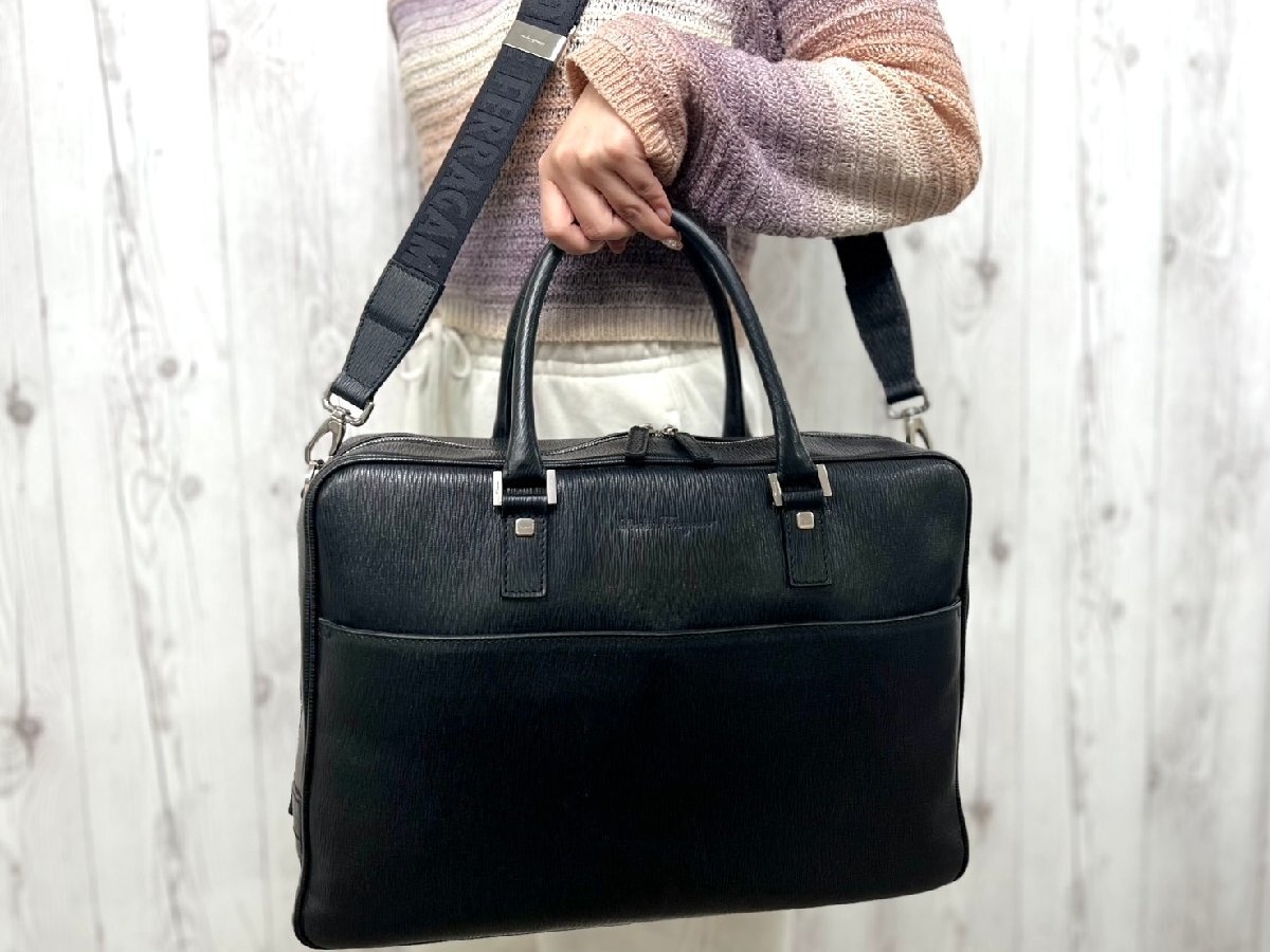 > 極美品 Ferragamo フェラガモ ビジネスバッグ ショルダーバッグ バッグ レザー 黒 A4収納可 2WAY メンズ 91629
