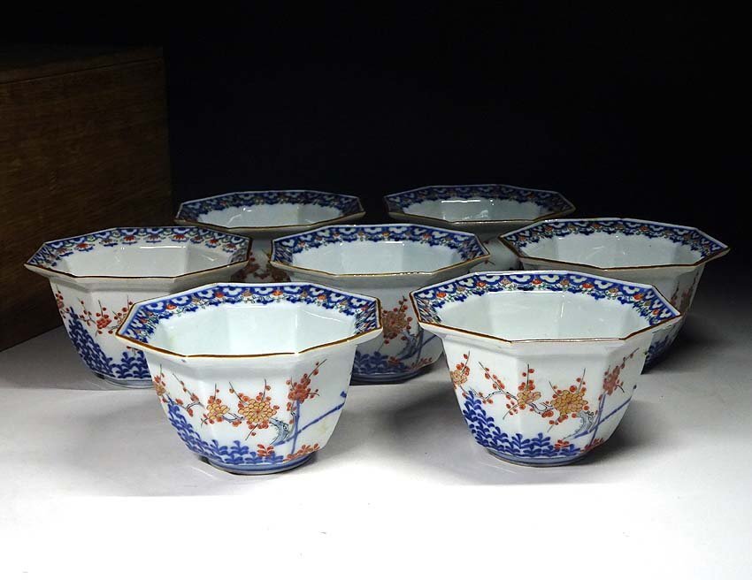 - 緑屋t■ 酒井田 柿右衛門 八角 向付 7点 木箱 i9/10-6505/6-4#80