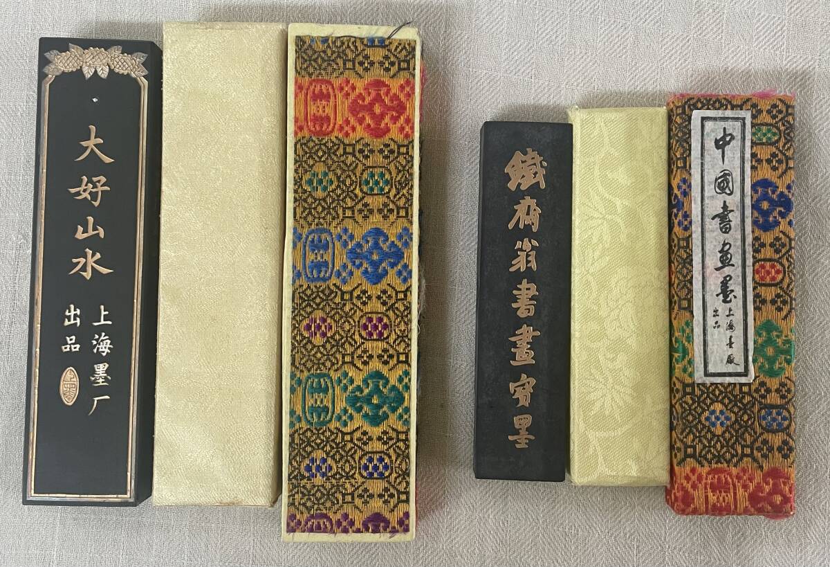 > 唐物 中国古墨 2点【上海墨厂出品 油煙一0一 大好山水 ・鐵斎翁寶墨】時代箱入 総重約102.6g/検索:文房四宝 徽州 超貢漆煙 程君房(1)