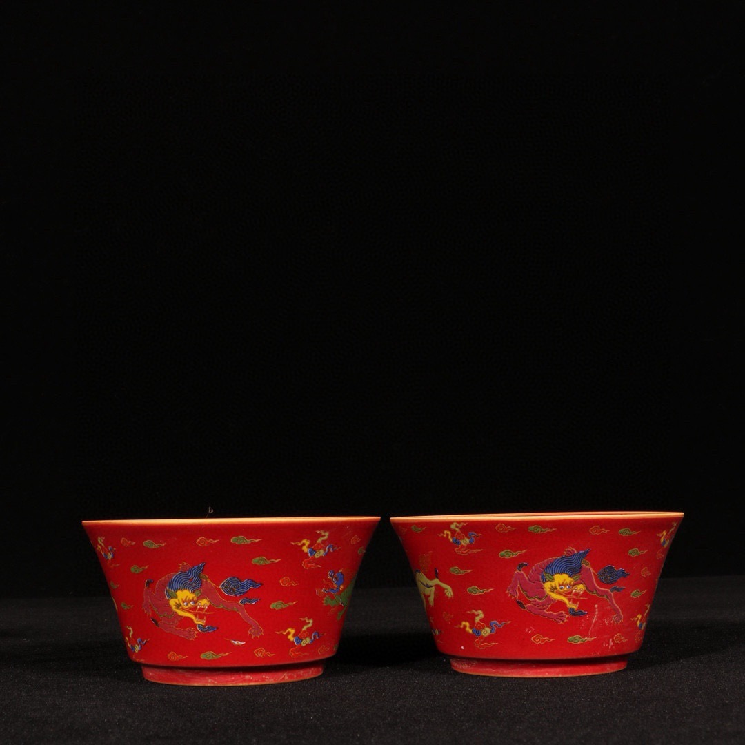 - 旧蔵 明代 成化 紅釉 海怪紋 杯 古陶瓷品 陶藝 古擺件 古置物 中国古玩 骨董品 時代物 稀少唐物