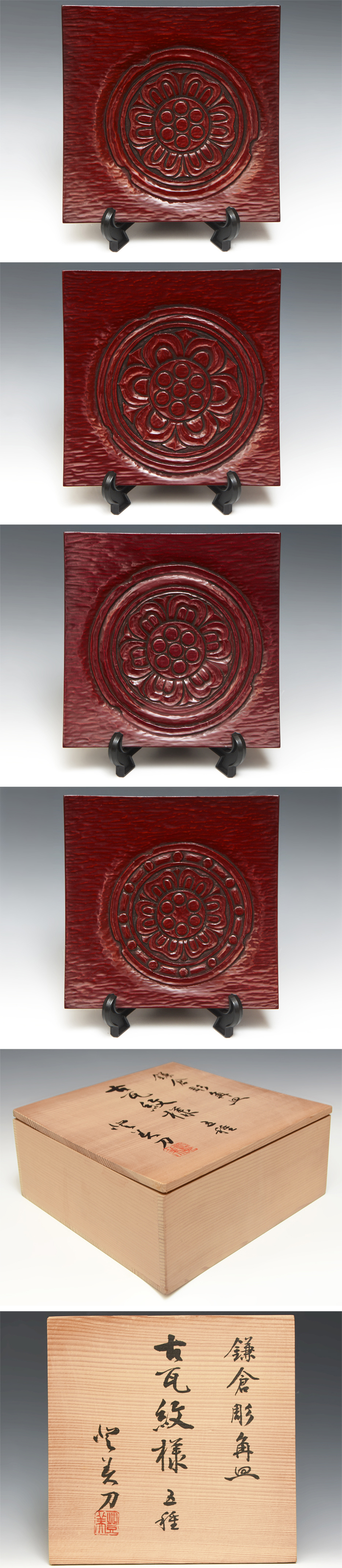 > 鎌倉彫角皿 古瓦紋様 5客揃 豊美 (造)共箱 茶道具 煎茶道具 菓子皿 菓子器 木工芸 漆工芸 漆芸 木製漆器 u1477a