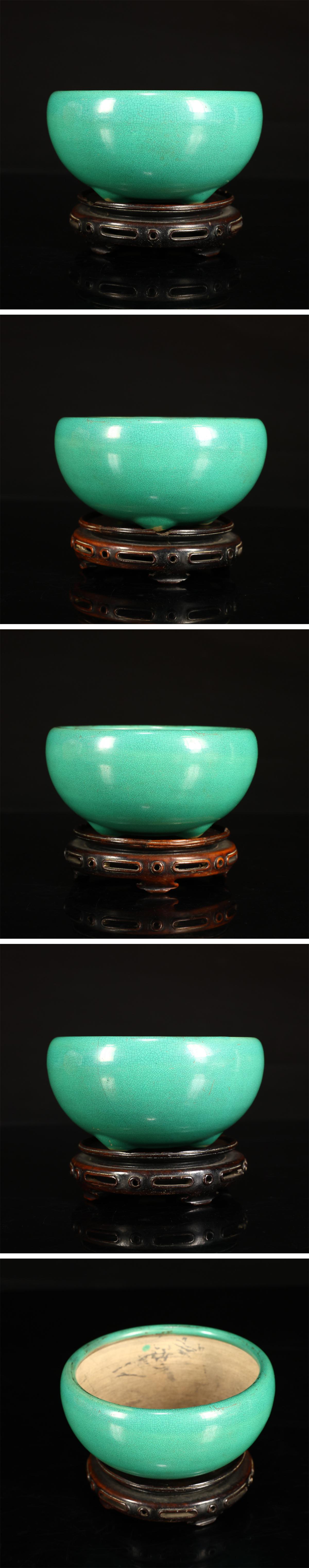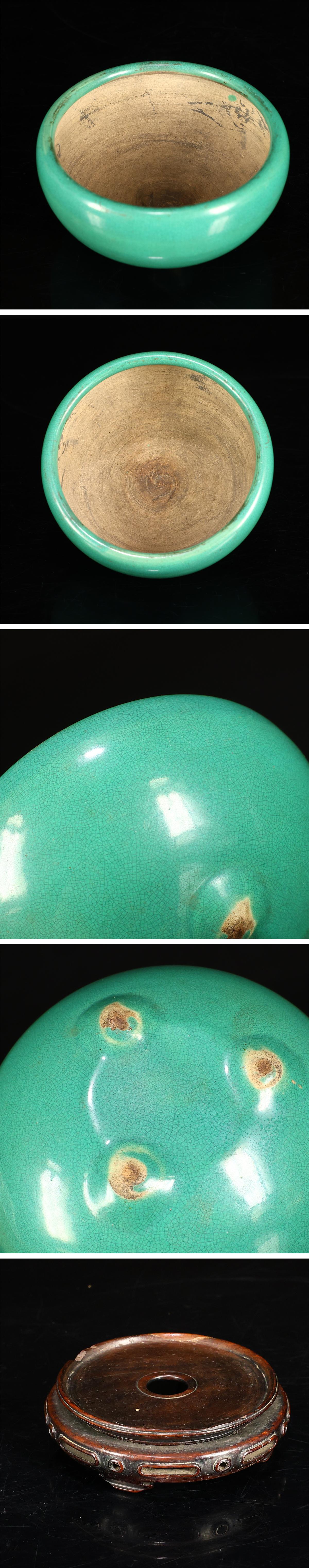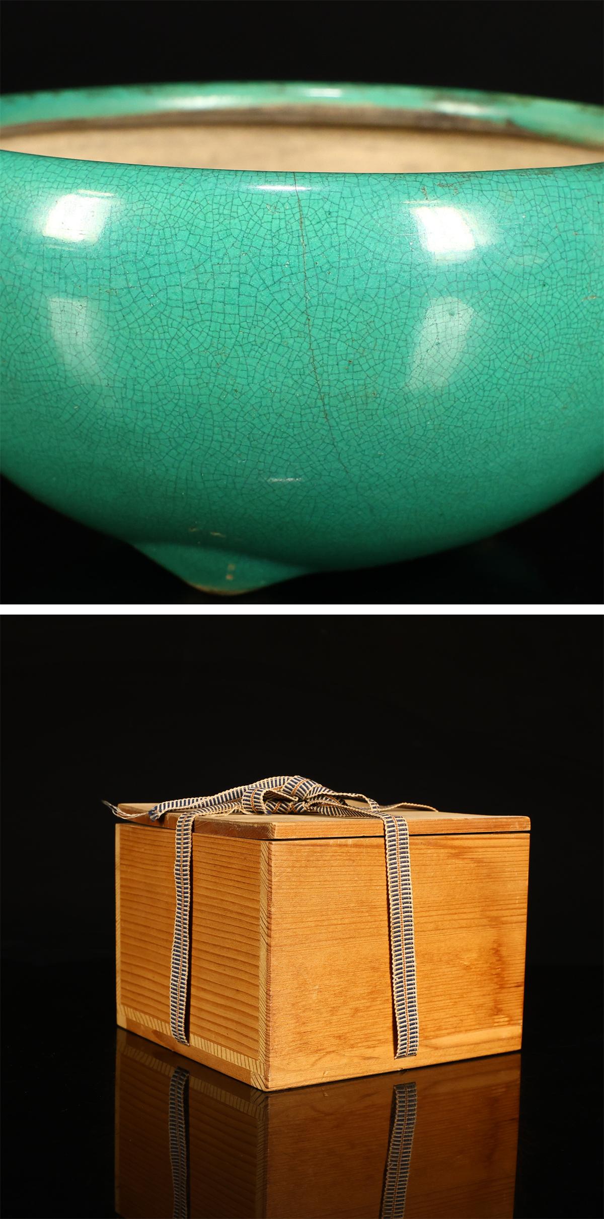 【吉】CN238 唐物 【清代哥窯】 緑釉三足 香炉 木台付/箱付Ig!拍卖