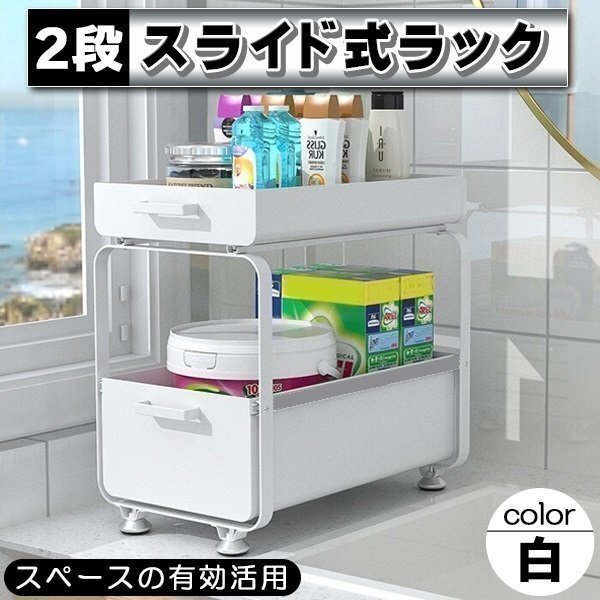 - キッチン収納 シンク下 スライドラック 2段 引き出し ホワイト 白 キッチンラック シンク下収納 コンロ下収納 調味料 棚 おしゃれ 収納