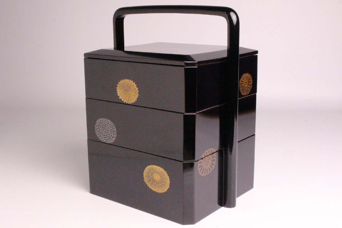 加賀漆器 金城萬茂 作 菊蒔絵 真塗松尾好 手提重「共箱」