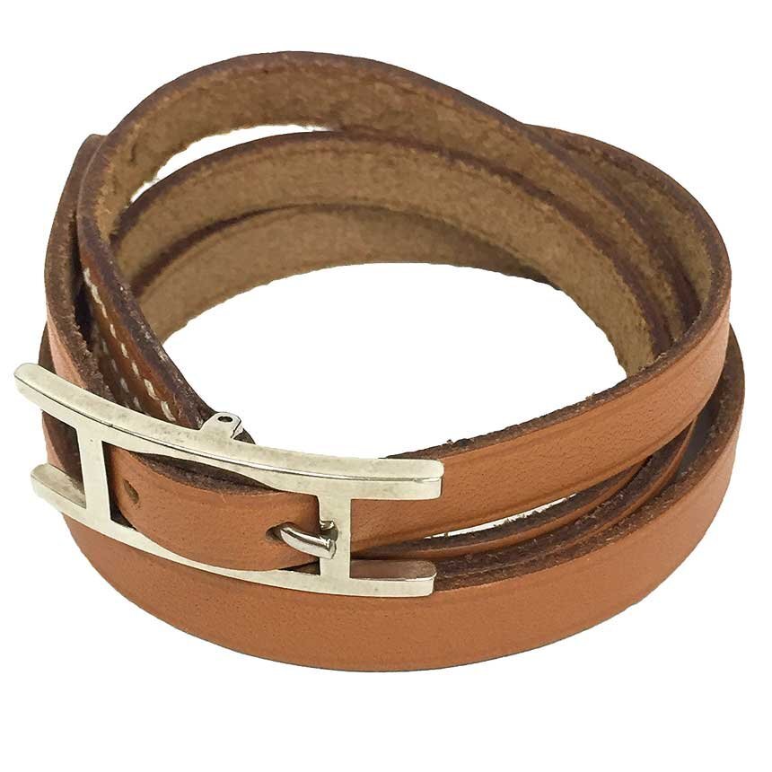 > 全国送料無料 HERMES エルメス アピ Api ブレスレット アピブレス 三連 チョーカー レザー キャメル シルバー金具 □のE刻 aq11894