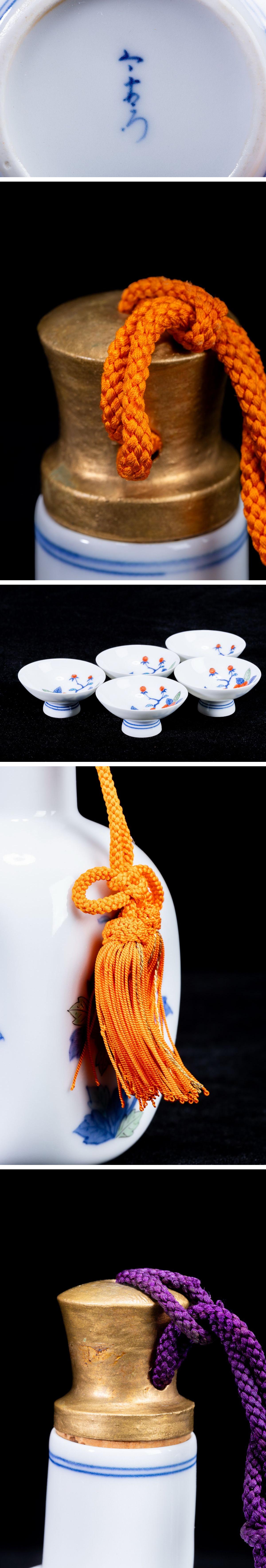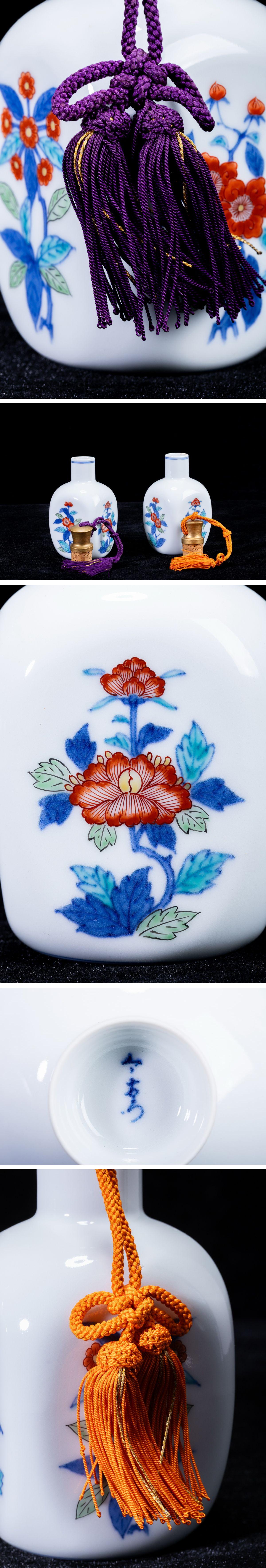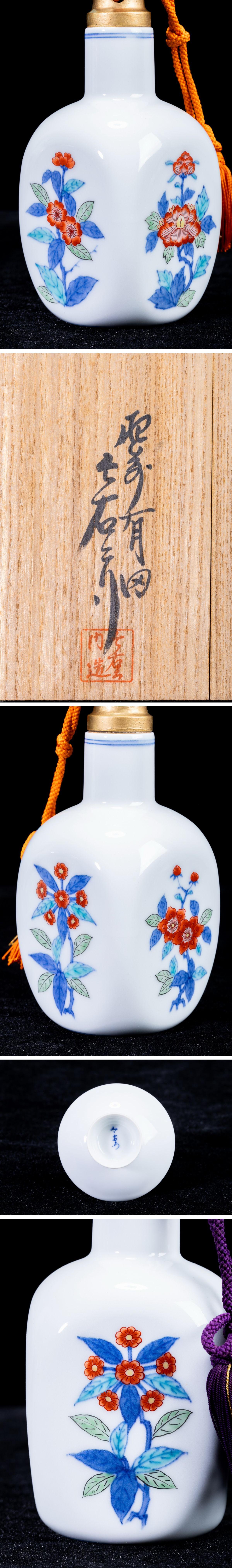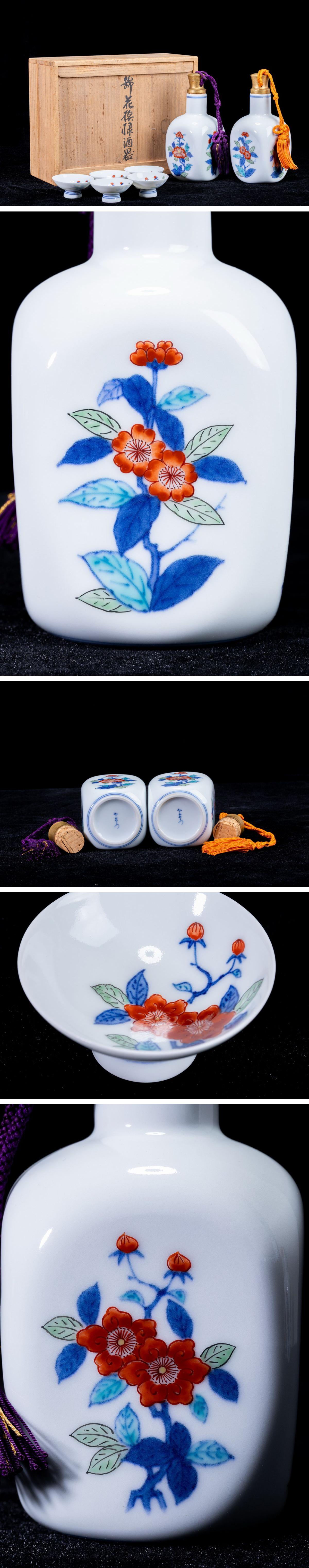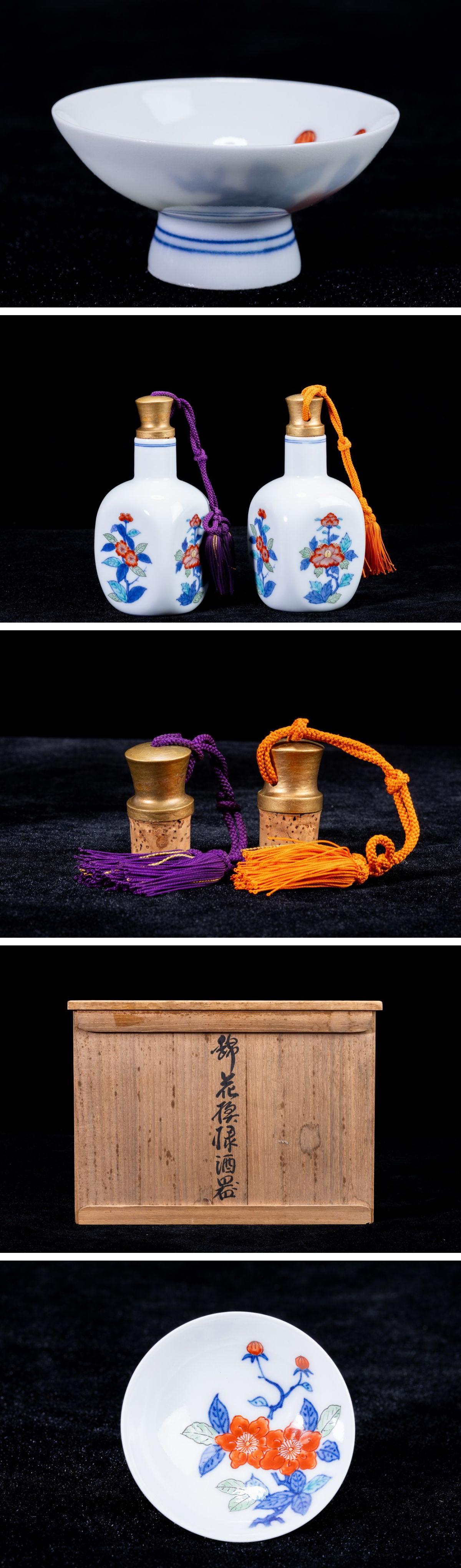 > 【珍品堂】1円から R38-N2 人間国宝 十三代 今泉 今右衛門 在銘 色鍋島 錦花模様 酒器 徳利盃 お猪口 共箱 木箱 時代物 工芸品 骨董品 古美
