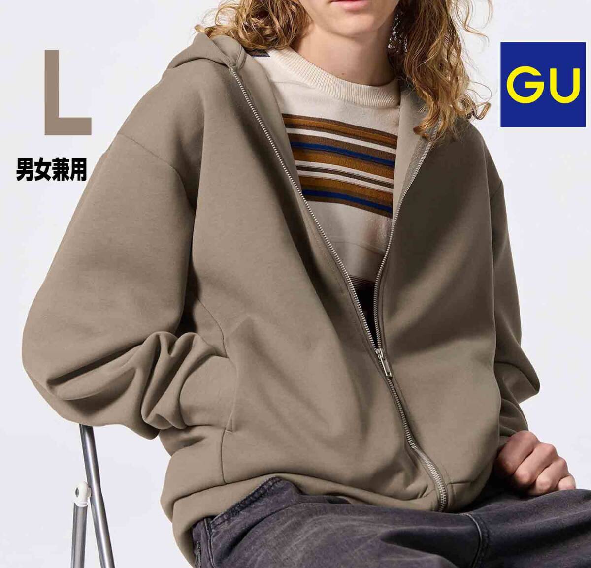 > GU パフスウェットフルジップパーカ ベージュ フーディー L ダブルフェイス