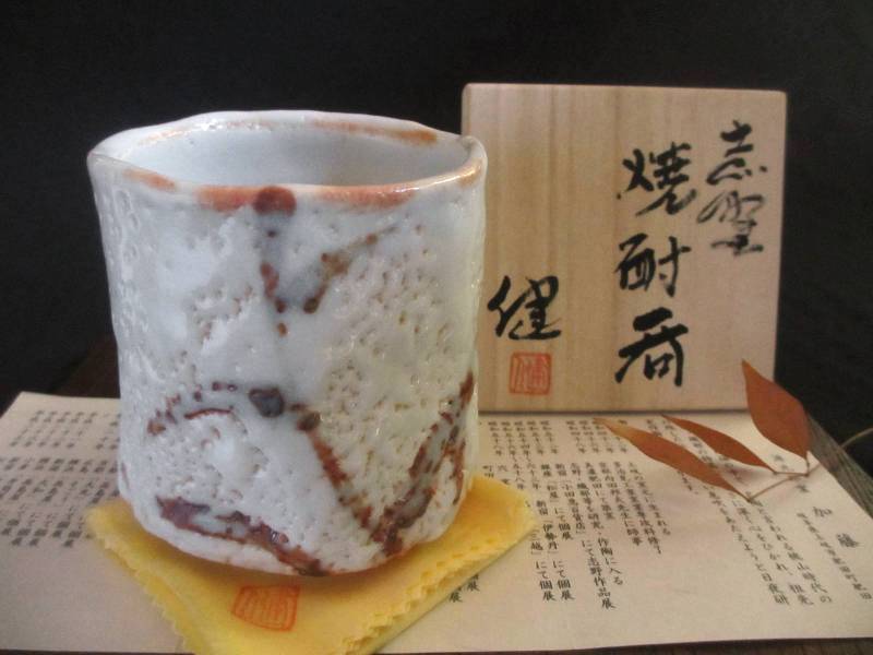 - 酒器 志野 草文 焼酎呑 (共箱) 源九郎窯 加藤健作 KA-211