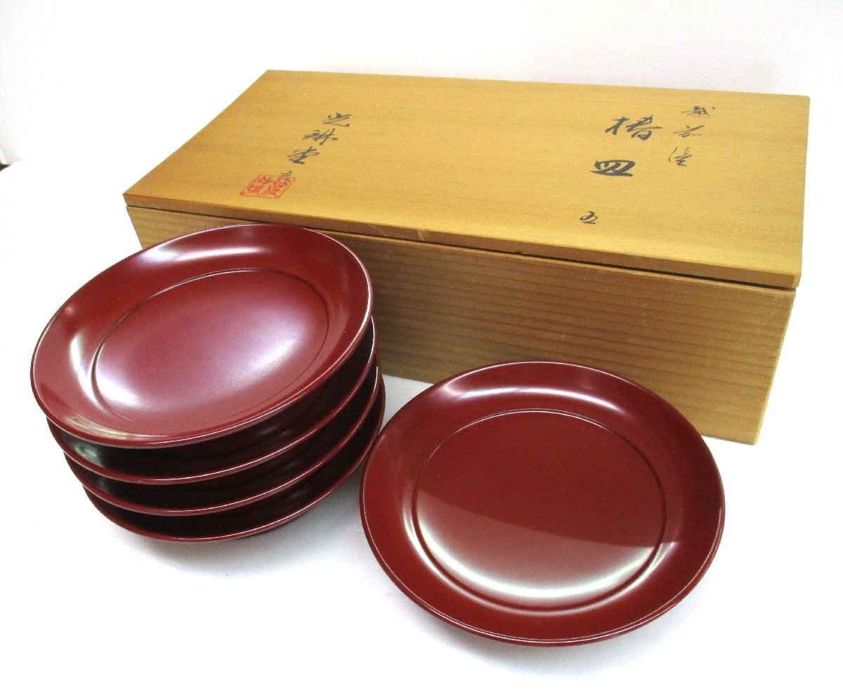 > 銘々皿 椿皿 5客 高台皿 越前塗 光琳堂 木箱付 直径14x高さ3.2cm 未使用 102159 ☆