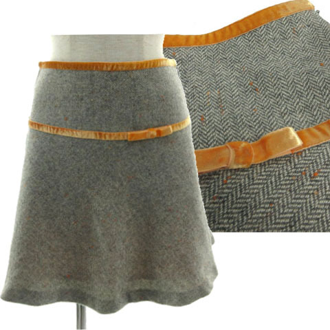 - クレージュ courreges ヘリンボーンツイードネップスカート EVHAM-72130 フレア ひざ上丈 ベロアリボン 起毛 グレー 白 オレンジ 38