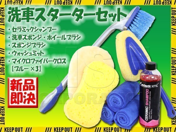 洗車用品 8点セット セラミックシャンプー スポンジ ホイール タイヤブラシ 柄付き ウォッシュミット マイクロファイバークロス ブルー
