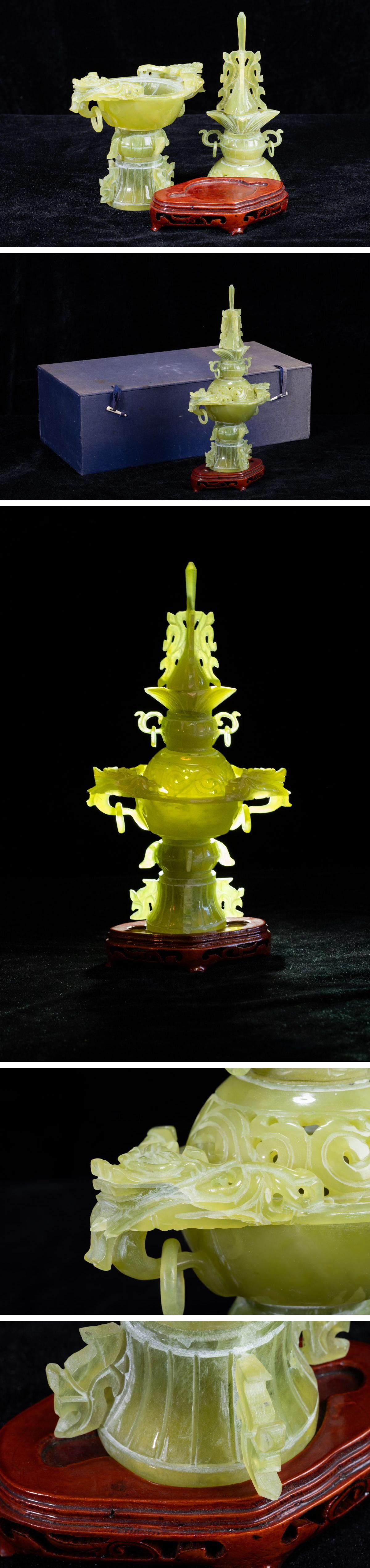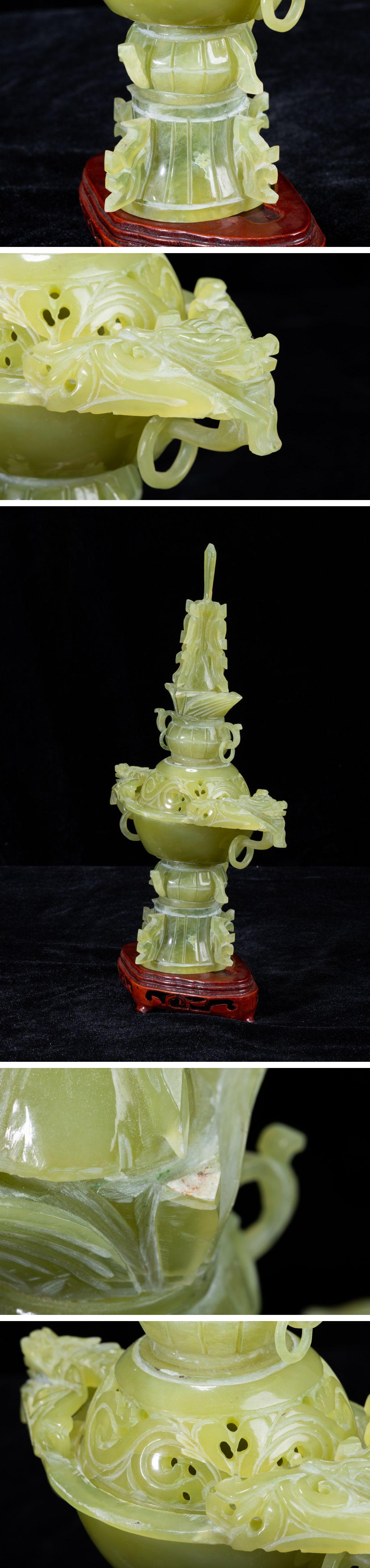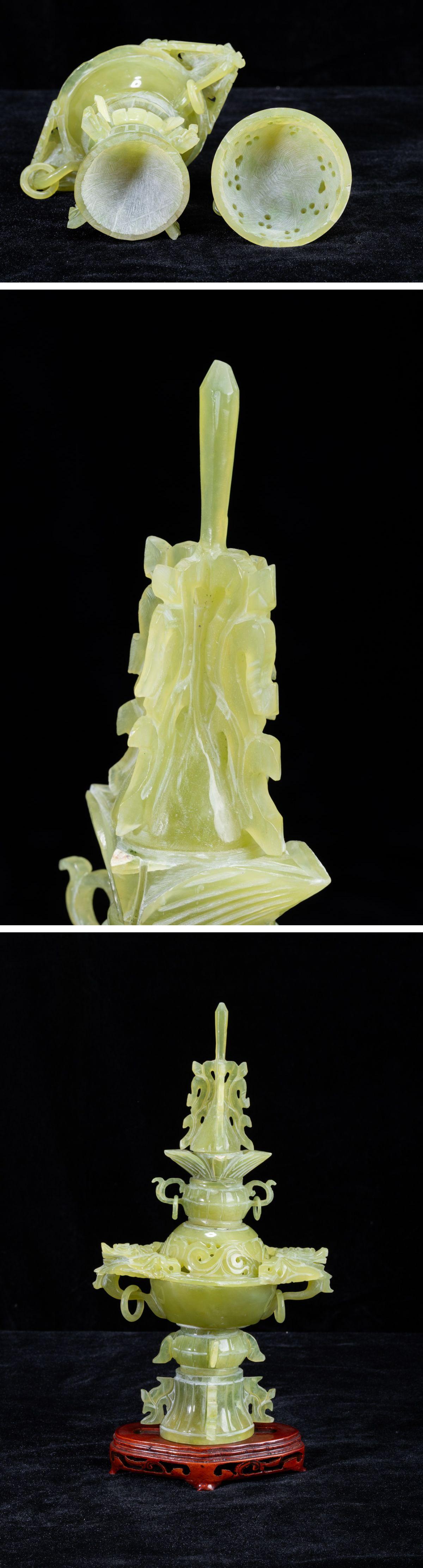 - 【珍品堂】1円から R59-V11 香炉 天然石 遊環彫刻 透かし彫刻 台付 重1001g 箱付 中国古美術 時代物 工芸品 鑑賞品 骨董品 古美術
