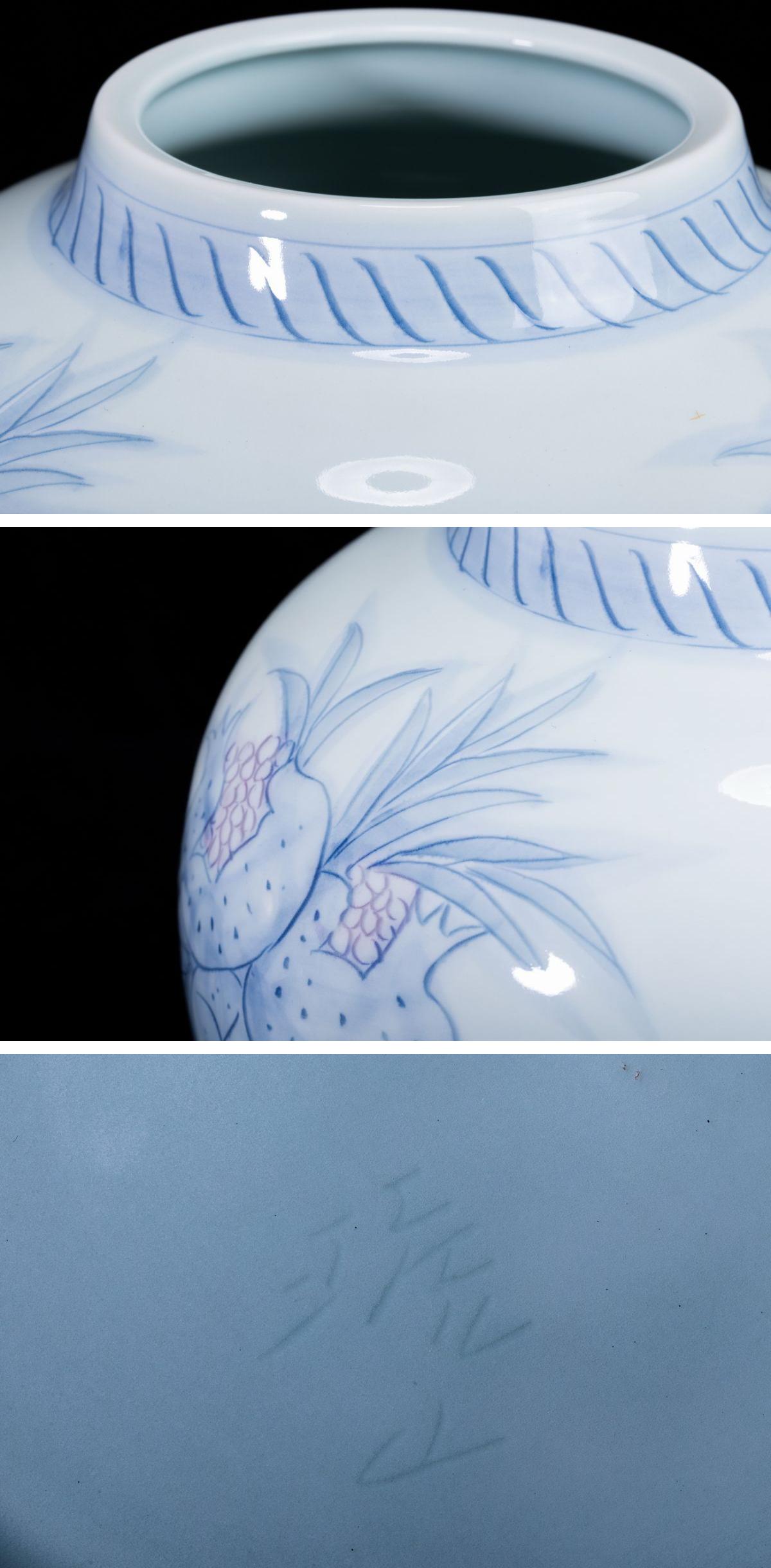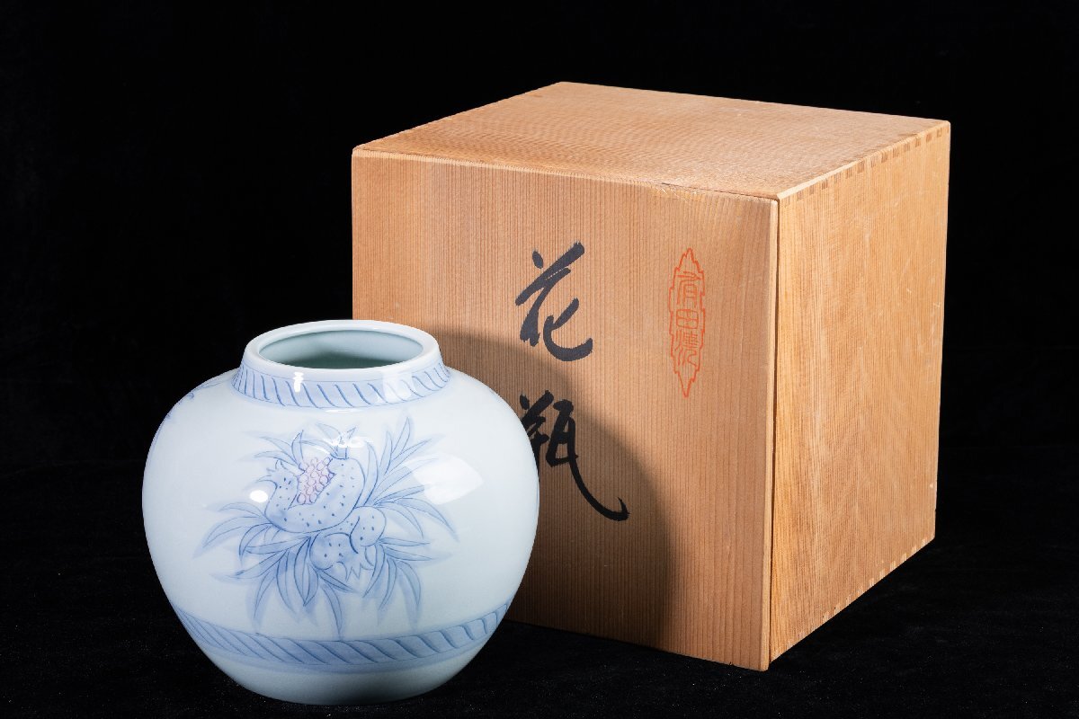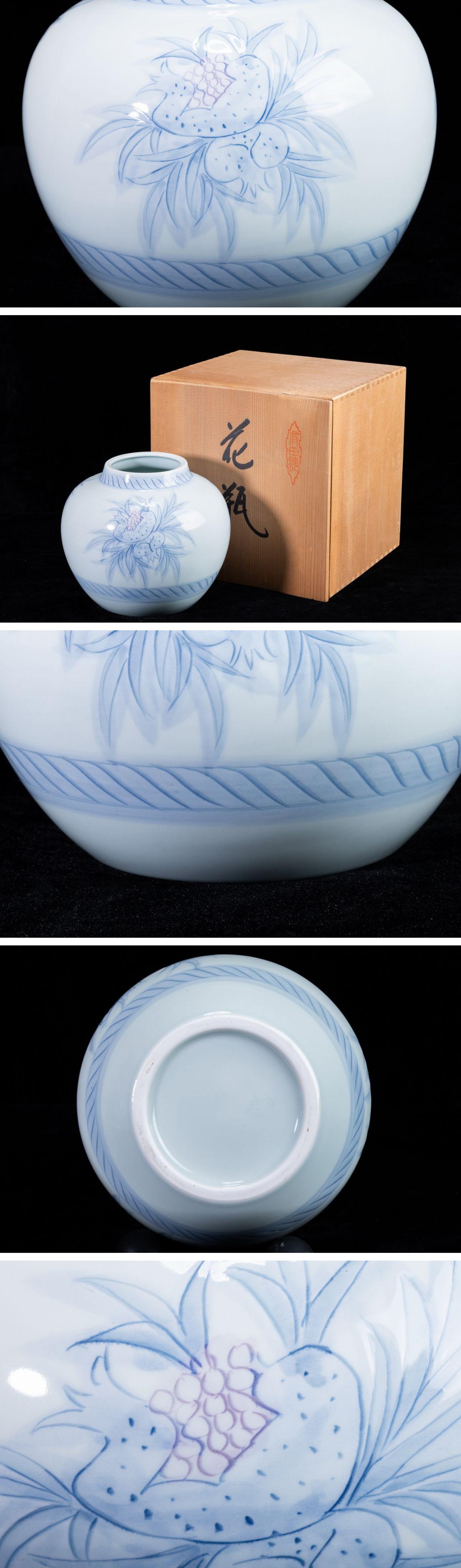 > 【珍品堂】1円から R61-V1 有田焼 琥山窯 琥山 作 在銘 呉須 染付 花瓶 高20.2㎝ 壺 共箱 木箱 花器 花入 時代物 工芸品 骨董品 古美術