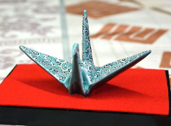 - 作家 谷敷正人 作 九谷焼 色絵折り鶴 唐草紋 陶器の折り鶴/良品/美品/共箱/桐箱/即決/送料無料