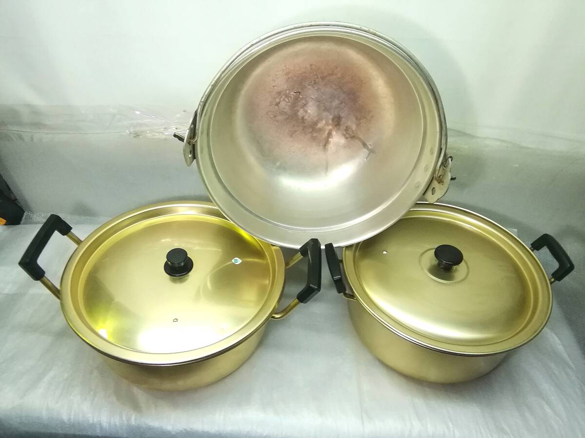 - アルミ鍋 3点セット 両手鍋 吊るし鍋 39cm/34cm/33cm ホクセイ/HOKUA 厨房鍋 中古品 ③