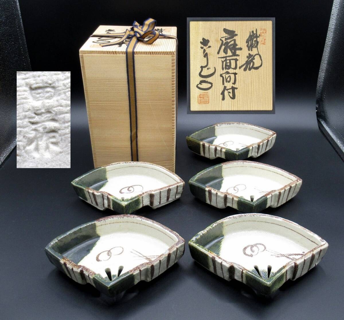 - 茶a『 村瀬甲二 織部 扇面向付 五客 共箱 』*茶道具. 茶懐石