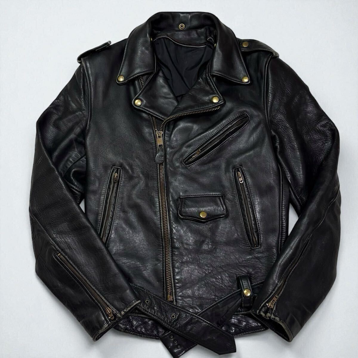 > 【極上の重量感】 ダブルライダースジャケット レザージャケット BRANDED ベルト 襟 コインポケット 38 Lサイズ相当 レザー ブラック 黒