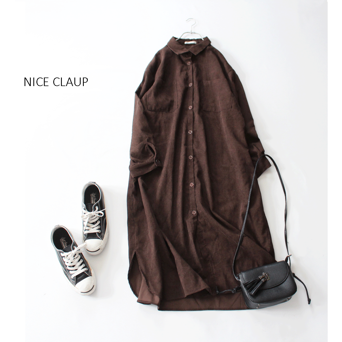 - NICE CLAUP★両胸ポケット付きゆったりコーデュロイシャツワンピース★
