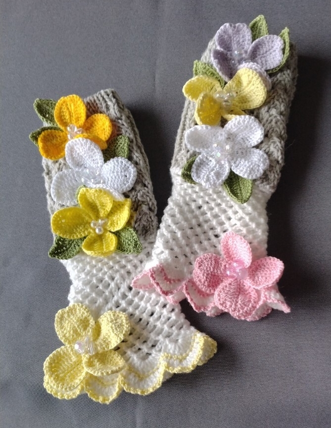 - アームウォーマー パールビーズ付 昼咲月見草 グレー&白 ami laine