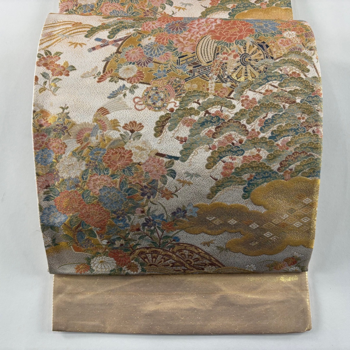 - 【美品】 袋帯 秀品 証紙 皇鳳錦 花車 片輪車 金糸 箔 ベージュ 全通 正絹 【中古】