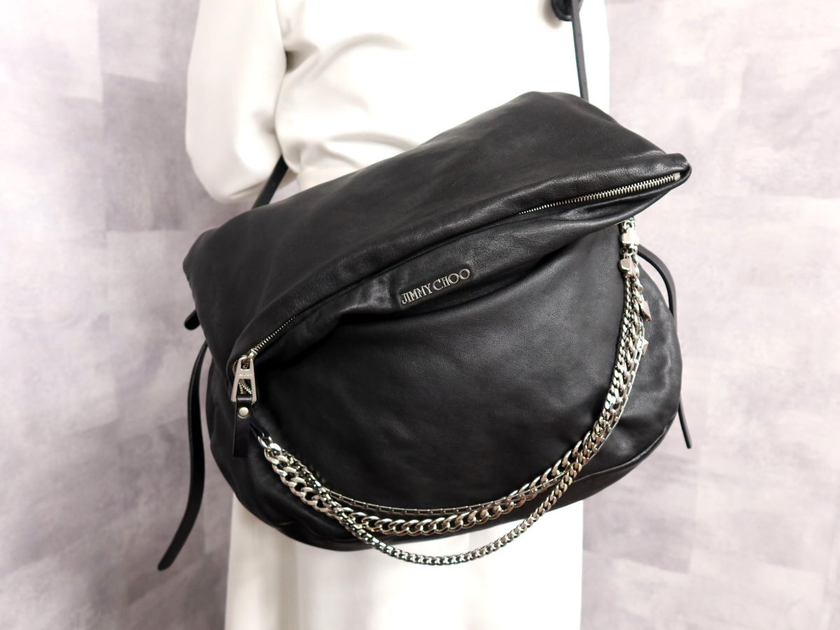 > ●超美品●JIMMY CHOO ジミーチュウ●バイカー●ロゴ金具●カーフ レザー 本革●チェーン ショルダー バッグ●黒●SV金具●A4●Js62836