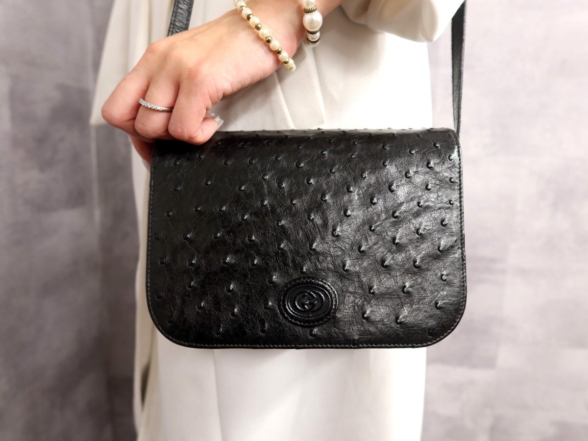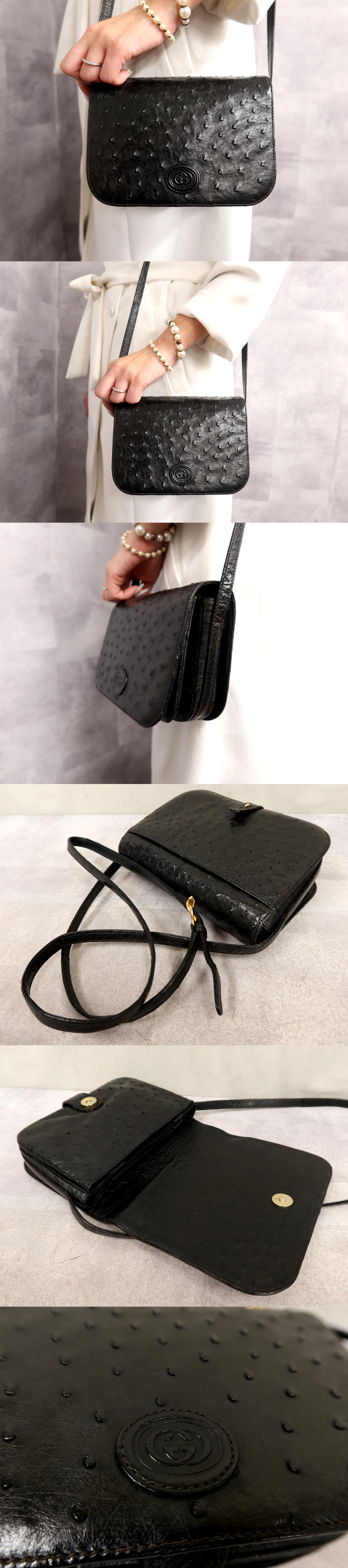 > ●超美品●GUCCI オールド グッチ●オーストリッチ 本 ダチョウ 革●ショルダー バッグ●黒●G金具●イタリア製●ヴィンテージ●Js62789