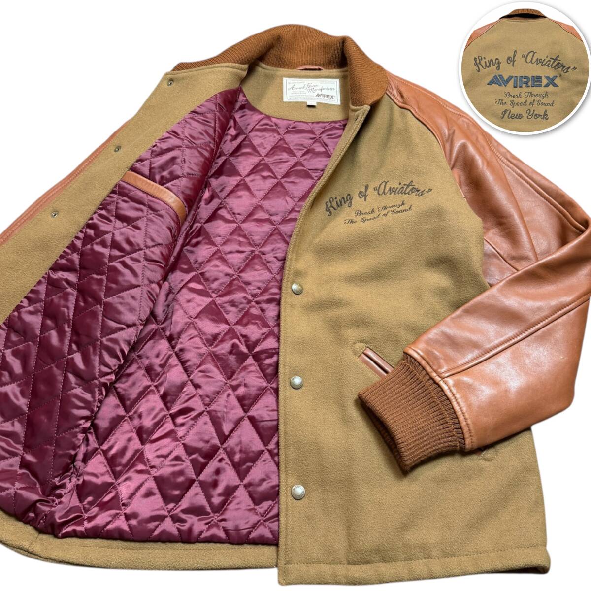 > 3692 極美品●XL相当 AVIREX スタジャン ブルゾン アヴィレックス ブラウン系 レザー切替 刺繍デザイン MA-1 ジャケット キルティング