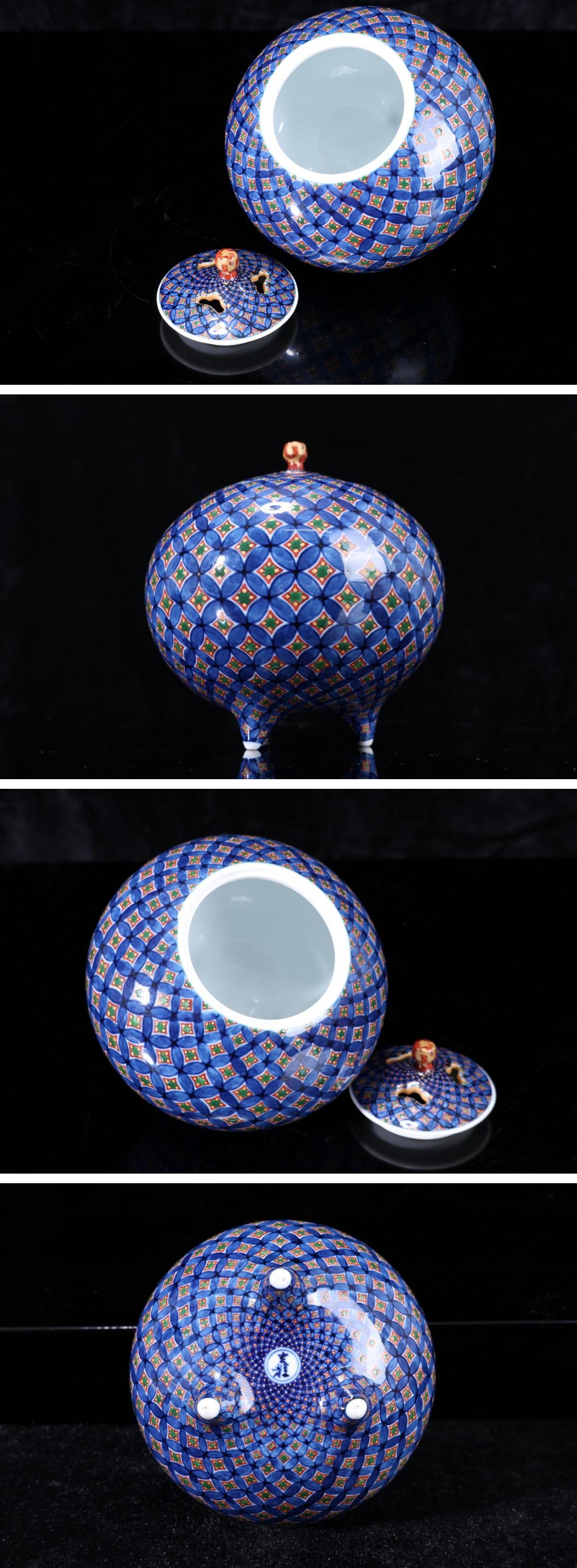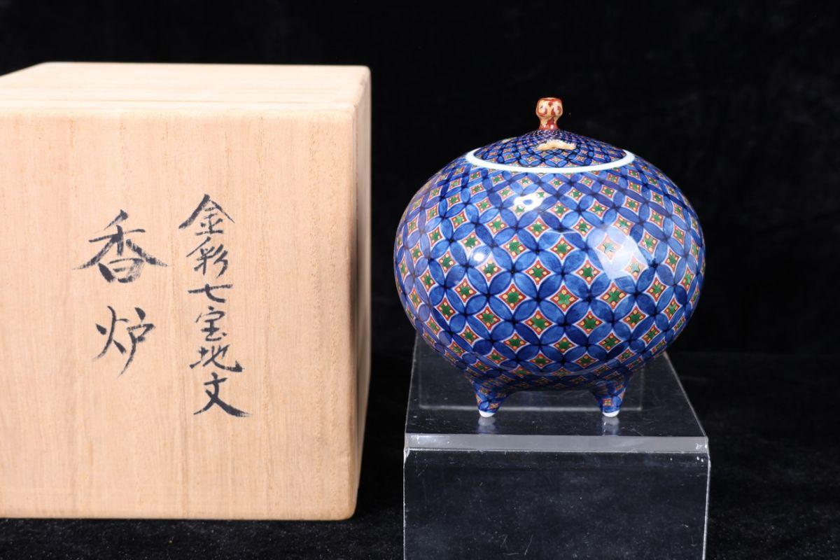 - 【珍品堂】1円から Q53-V22 有田焼 村上玄輝 作 名工 金彩 七宝 地紋 共箱 在銘 染錦 三足 香炉 骨董品 古美術 香道具 懐石 伝統工芸