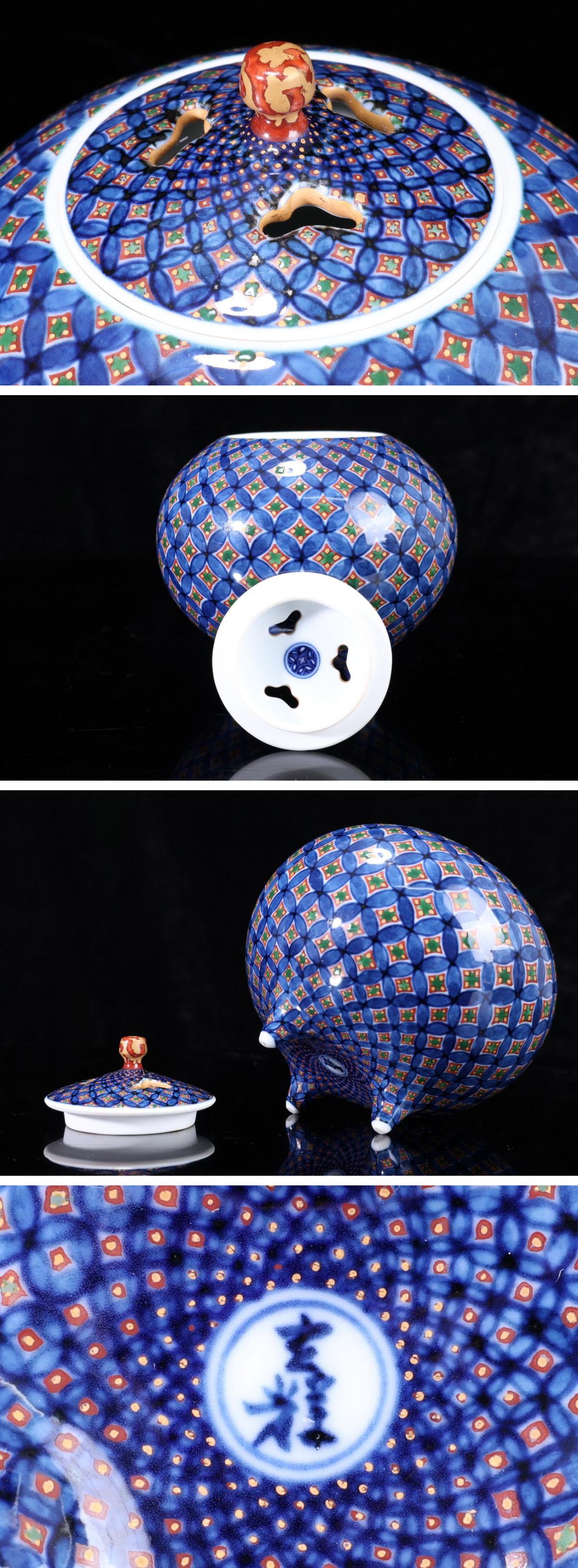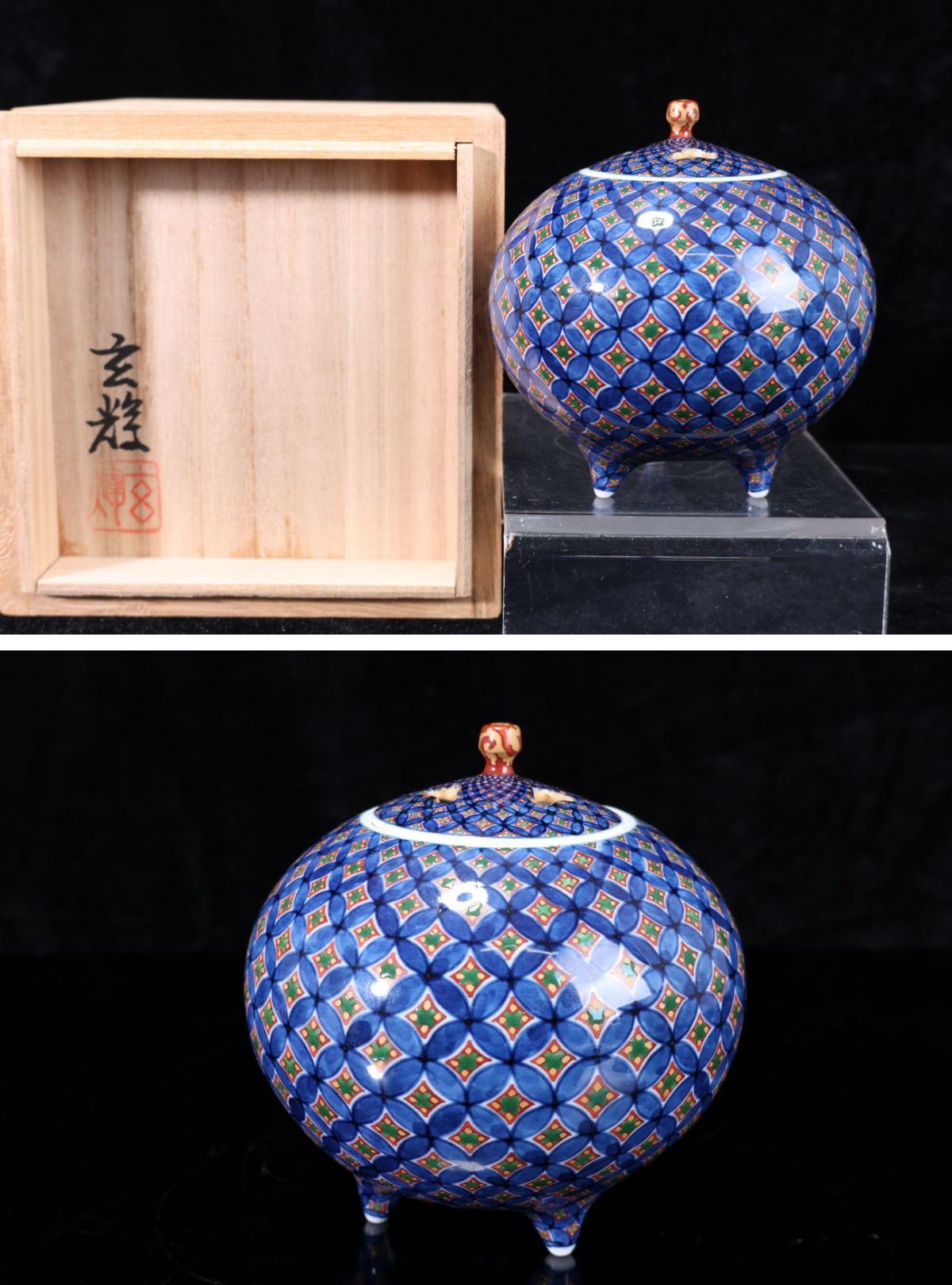 > 【珍品堂】1円から Q53-V22 有田焼 村上玄輝 作 名工 金彩 七宝 地紋 共箱 在銘 染錦 三足 香炉 骨董品 古美術 香道具 懐石 伝統工芸