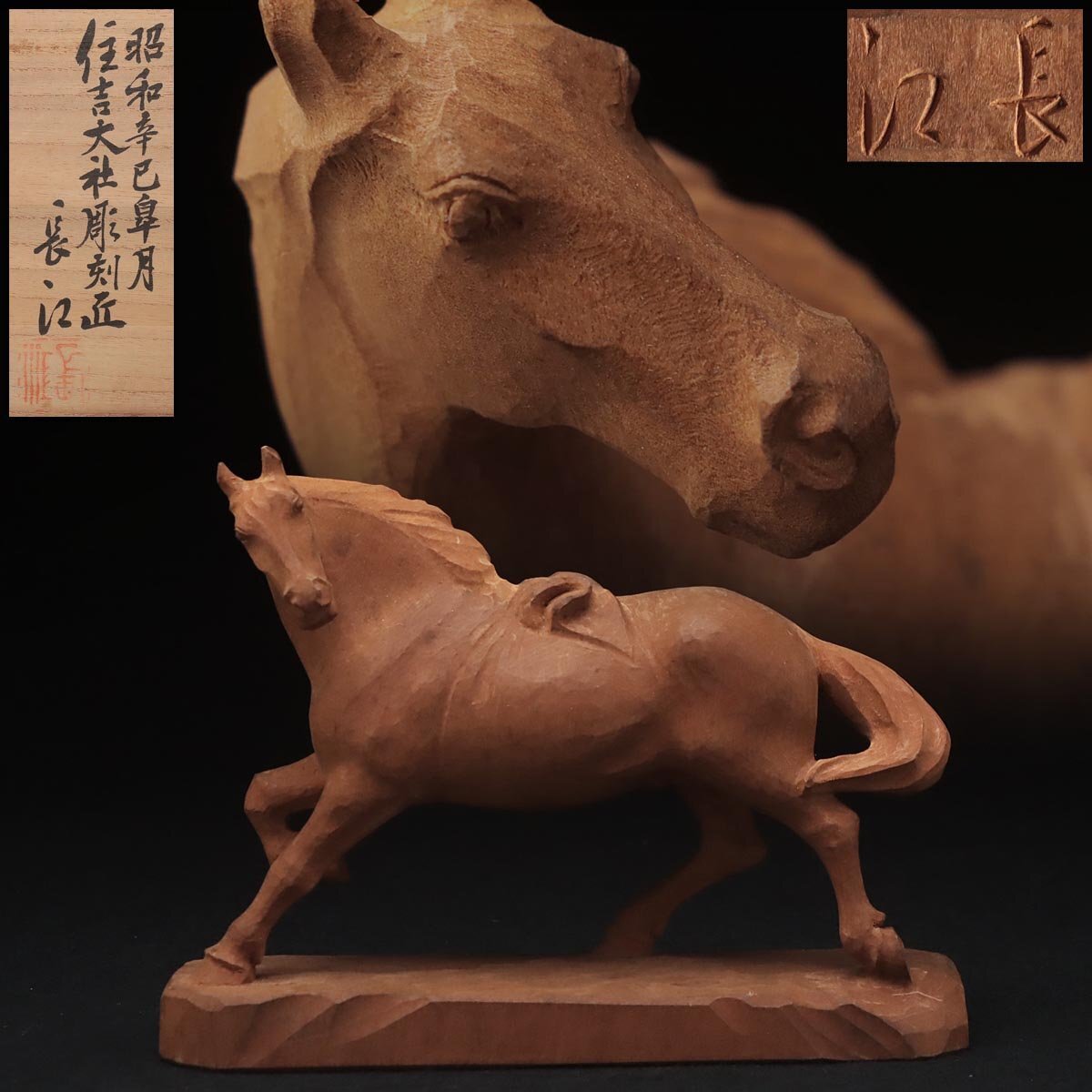 - JQ133 【住吉大社彫刻匠 山野長江 作】木彫「神馬」置物 幅17cm 共箱附・一刀彫「うま/ウマ」床置 床飾り 木工芸