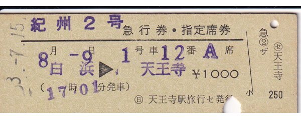 - 鉄道切符 硬券 国鉄 紀州 急行券・指定席券 白浜→天王寺