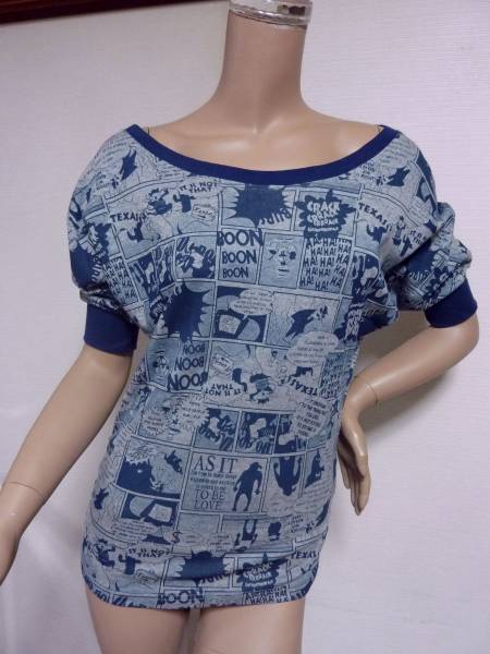 > 匿名配送 送料無料 新品 コミック総柄 ドルマンスリーブ トップス グレー ブルー アメコミ 綿 アメリカン 英字 カジュアル